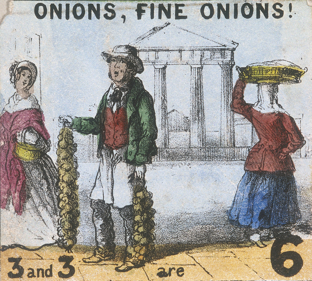 'Onions, Fine Onions!' An onion seller holding two strings of onions, with two passing figures. From Cries of London, c1840.
