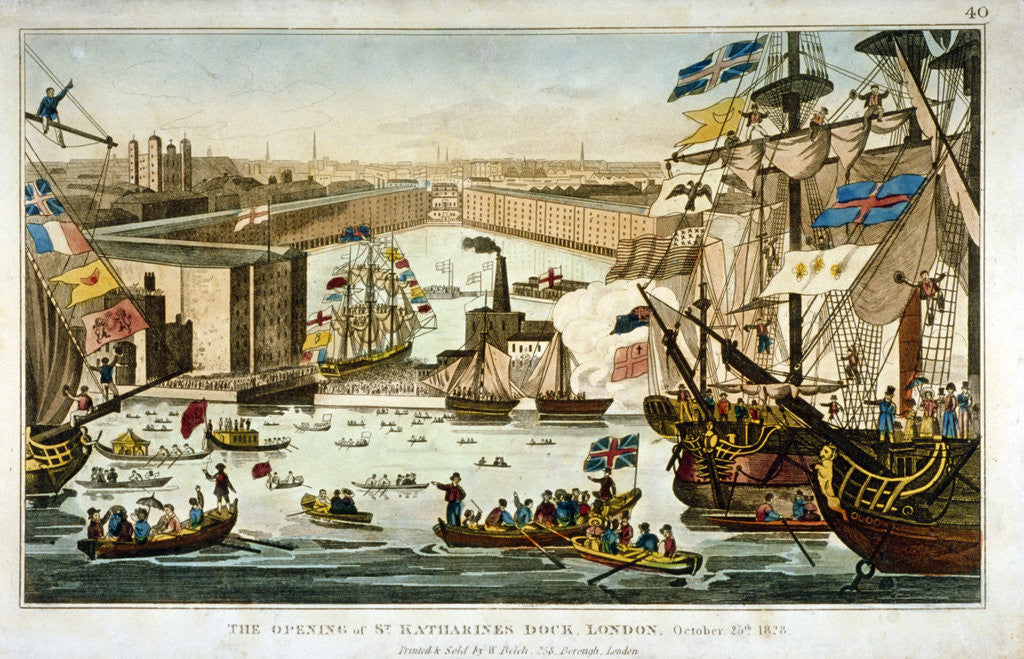 Opening of St Katharine's Dock, London, October 25 1828. A scene with crowds of people on the shore and in ships, barges and smaller boats. The docks were the only major project to be undertaken in London by the famous engineer Thomas Telford.