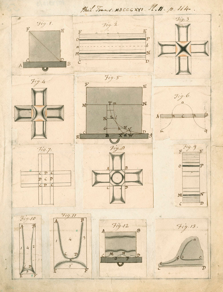 Plate 2 from the paper 'On new properties of heat, as exhibited in its propagation along plates of glass', by David Brewster, Philosophical Transactions of the Royal Society, vol.106 (1816), pp.46-114. Figures 1-13, individual drawings, two coloured, mounted on a backing sheet.