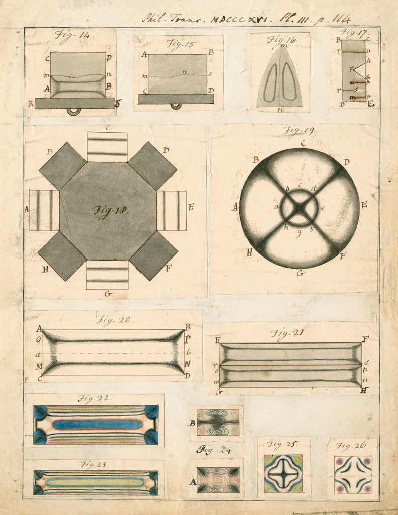 Plate 3 from the paper 'On new properties of heat, as exhibited in its propagation along plates of glass', by David Brewster, Philosophical Transactions of the Royal Society, vol.106 (1816), pp.46-114. Figures 14-26, individual drawings, six coloured, mounted on a backing sheet.