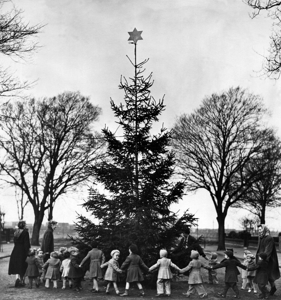 Orphans from Liverpool Cottage Homes, Fazakerley, dance round a Christmas tree. Liverpool, Merseyside, 13th December 1956