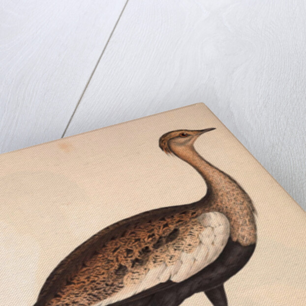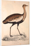 Otis Himalayanus (young male) or Delicious Bustard, Otis deliciosa. Birds from the Himalaya Mountains, engraving 1831 by Elizabeth Gould and John Gould. John Gould was working as a taxidermist,he was known as the 'bird-stuffer', by the Zoological Society. Gould's fascination with birds from the east began in the late 1820s when a collection of birds from the Himalayan mountains arrived at the Society's museum and Gould conceived the idea of publishing a volume of imperial folio sized hand-coloured lithographs of the eighty species, with figures of a hundred birds. Elizabeth Gould made the drawings and transferred them to the large lithographic stones. They are called Gould plates.