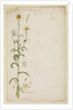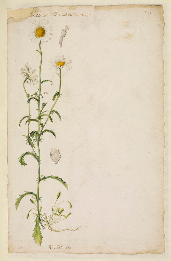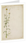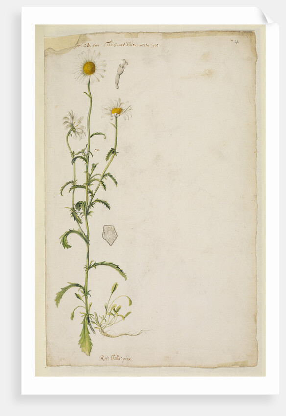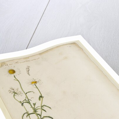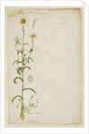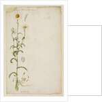 Botanical study of ox-eye daisy ['the great daizis or ox-eye']. With flower detail and section of stem.
