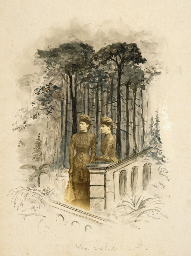Page from photograph album stamped KEG on cover. Albumen prints with painted decoration and borders. 1870s.