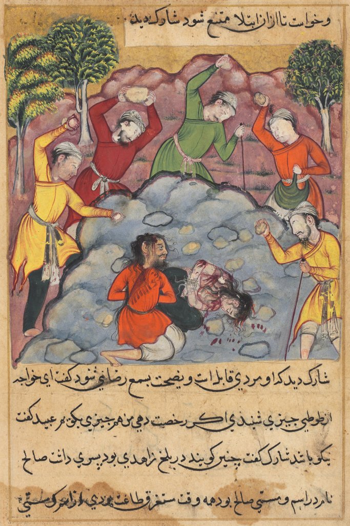 Page from Tales of a Parrot (Tuti-nama): The Raja?s daughter and her lover stoned to death for adultery, c. 1560.