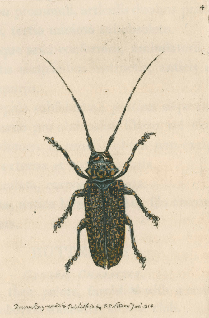 Entomological study of an insect identified by the author as the Painted lamia Lamia picta, native to Australia. Plate 4 from The zoological miscellany; being a description of new, or interesting animals, by William Elford Leach, volume 1 (London, 1815). The plate is inscribed: 'Drawn Engraved & Published by R. P. Nodder Jany. 1814.' William Elford Leach (1790-1836) British naturalist was elected a Fellow of the Royal Society in 1816.