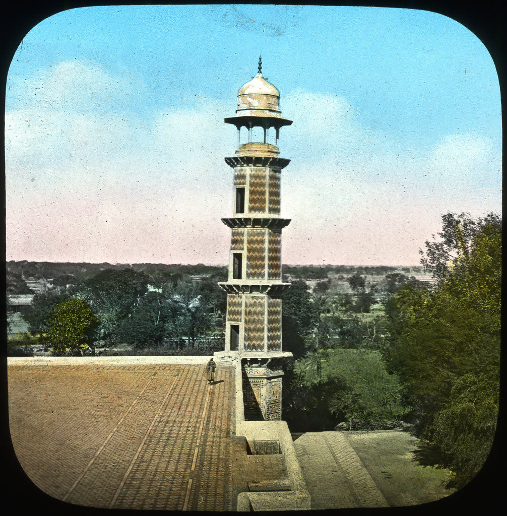 Panorama, Lahore, Punjab, India, late 19th or early 20th century. View showing one of the four-tiered minarets of the mausoleum of the Mughal Emperor Jahangir, who ruled from 1605 until 1627. Lantern slide.