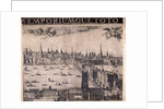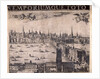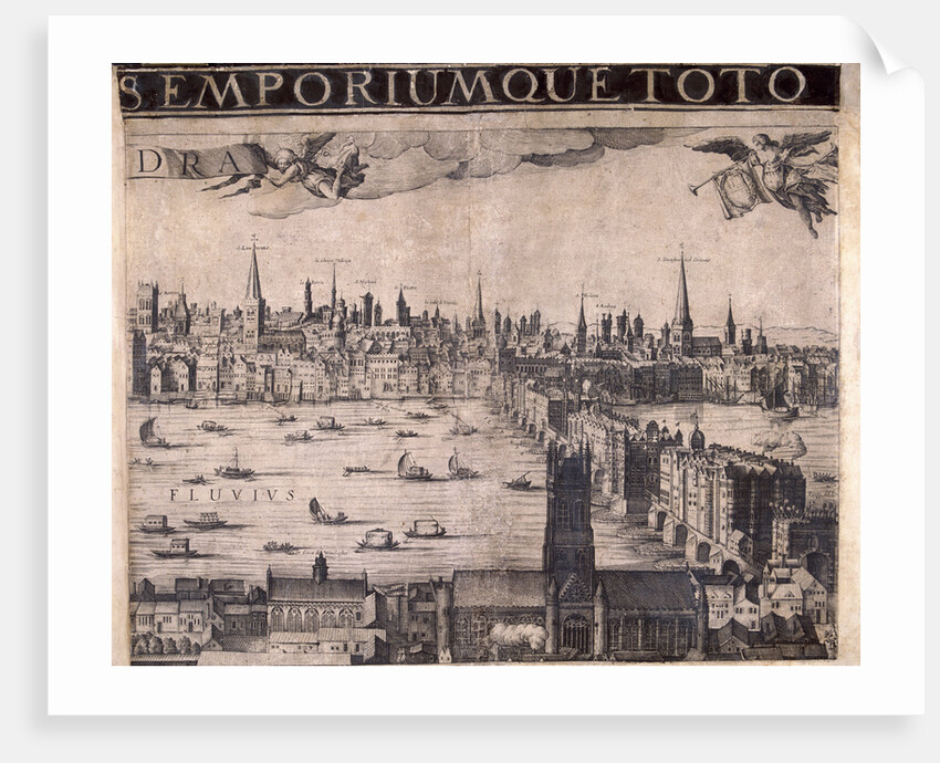 Panoramic view of the City of London showing the area between St Antholin (no longer in existance) and St Dunstan in the East with Southwark, London Bridge covered with houses, and the River Thames in the foreground; also showing Southwark Cathedral, a title above, two angels in the sky, one holding a ribbon, the other with two bugles, and boats, barges and ships on the river. One part of a four piece panoramic view of the City of London.