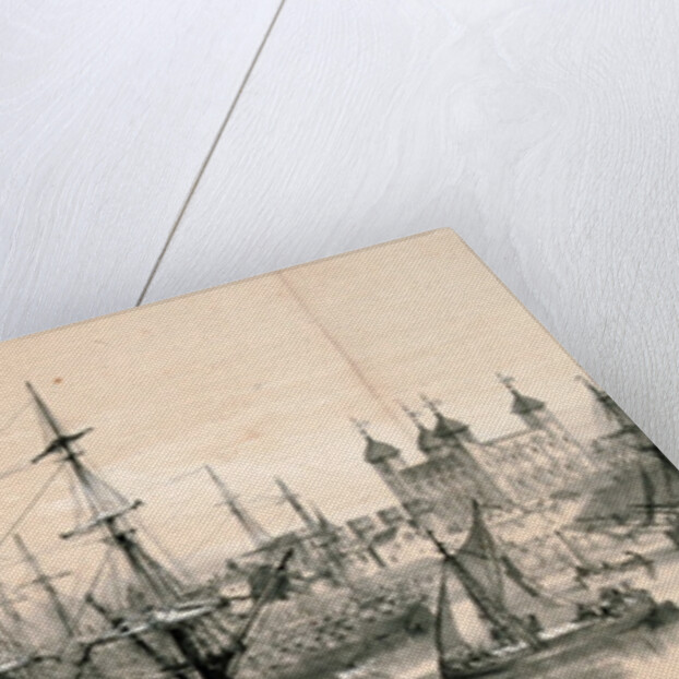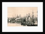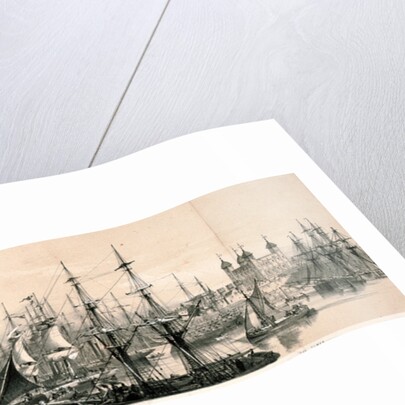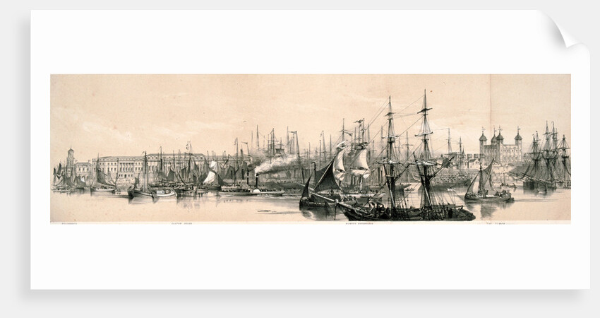 View of the north bank of the River Thames from the south bank of the river looking towards the Tower of London on the right, 1851. With boats on the River Thames.
