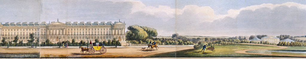 Panoramic view of the area around Regent's Park, London, 1831. Panorama showing Hanover Terrace, and open land, with figures, including a man with a wheelbarrow, horses and a carriage.