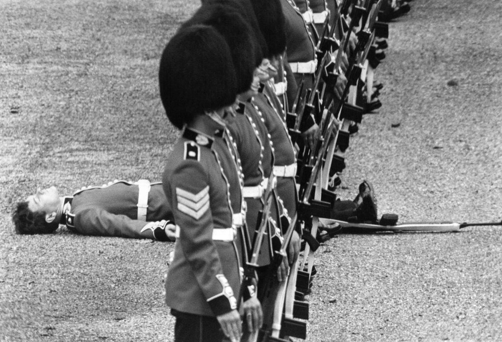 The Wobblies: Parading guardsmen threw a fit of the wobblies on Saturday (9-6-79). The weather was go humid they just could not toe the line during the final rehearsal for the Trooping the Colour ceremony in London on Saturday (16-6-79). In an unguarded moment, two young soldiers fainted. Thousands of tourists, crammed into Horse Guards Parade, watched as the two were carried away on stretchers - and the thin red line became a little thinner. Unguarded Moment....It's all too much for this guard, as he hits the deck. 9th June 1979