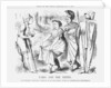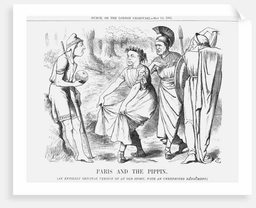 'Paris and the Pippin', 1881. In the centre of this cartoon is the Duke of Richmond. Behind him are Lords Hugh McCalmont Cairns and Salisbury. These were the three main contenders for the office of Conservative Leader in the Lords following the death of Disraeli, Lord Beaconsfield. The unexpected denouement came about when Lord Salisbury was elected over the more fancied Duke of Richmond. From Punch, or the London Charivari, May 14, 1881.
