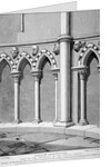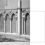 Part of the vestibule of the Temple Church, City of London, 1812. View showing a series of gothic arches divided by pilasters with corinthian capitals. Carved heads decorate the spandrels.
