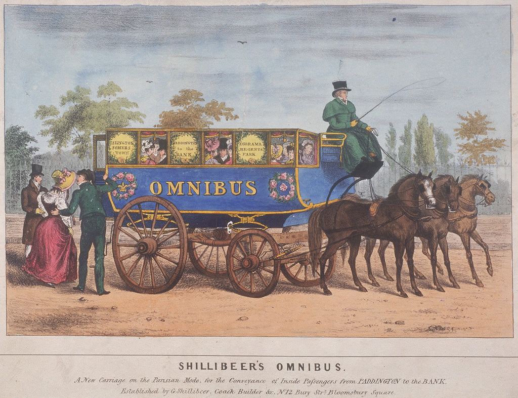View of passengers using Shillibeer's omnibus, London, 1829. The omnibus ran from Paddington to Bank.