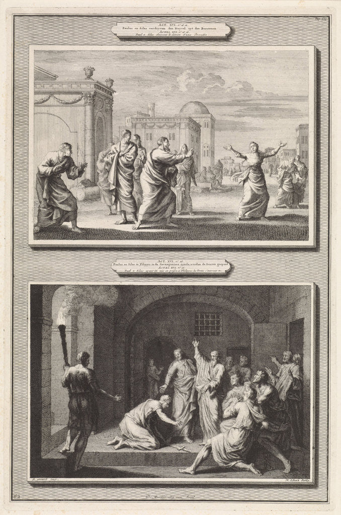 Paul healed a possessed woman and the conversion of the Philippian jailer, Jan Luyken, Hendrik Elandt, Bernard Picart, 1700