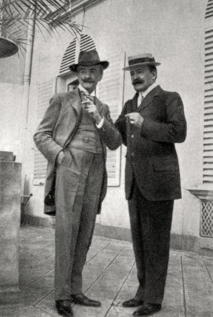 Paul Hervieu and Marcel Prevost, French authors and dramatists, 1905. A photograph from Album de Photographies dans L'Intimite de Personnages Illustres, 1855-1915, 7th album, Editions MD, Paris.