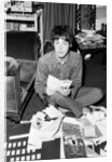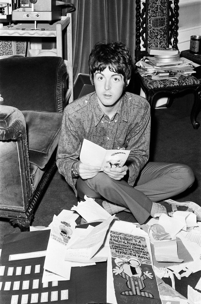 Paul McCartney of The Beatles sitting on the floor cross legged as he opens up birthday cards from his fans on his 25th birthday. 18 June 1967