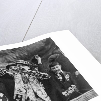 Pearly king and queen in high spirits, London, 1926-1927. Cockney 'Pearly kings' (originally costermongers - fruit and vegetable sellers), wore suits covered in mother-of-pearl buttons. Illustration from Wonderful London, volume I, edited by Arthur St John Adcock, published by Amalgamated Press (London, 1926-1927).