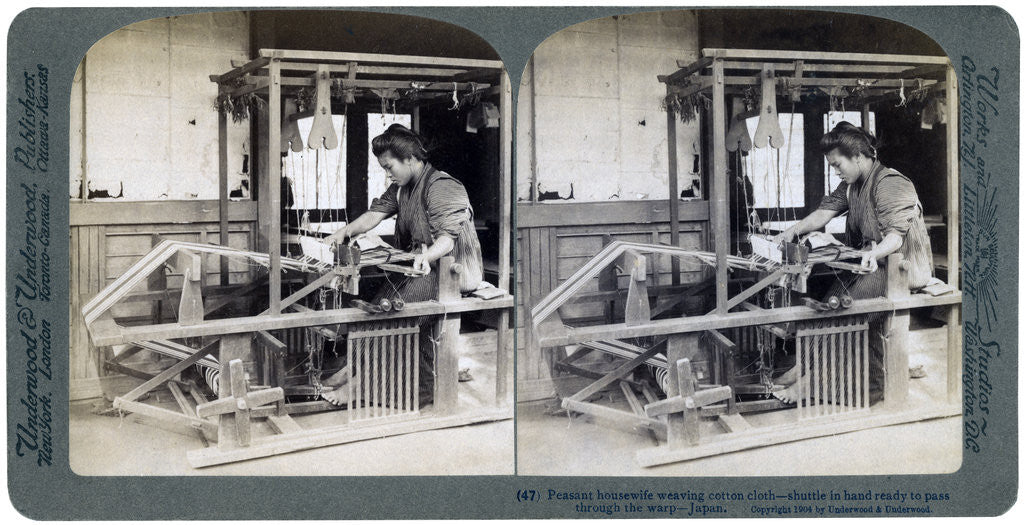 Peasant housewife weaving cotton cloth, Japan, 1904. Stereoscopic slide.