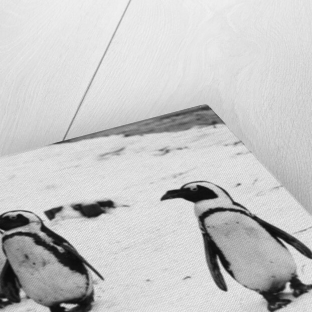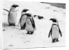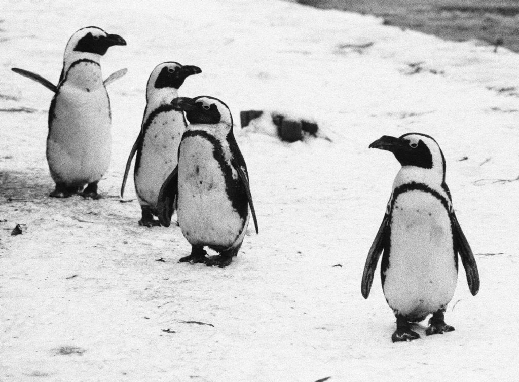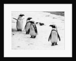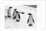 Pengiuns explore their enclosure at London Zoo following a fresh fall of snow. 27th December 1970