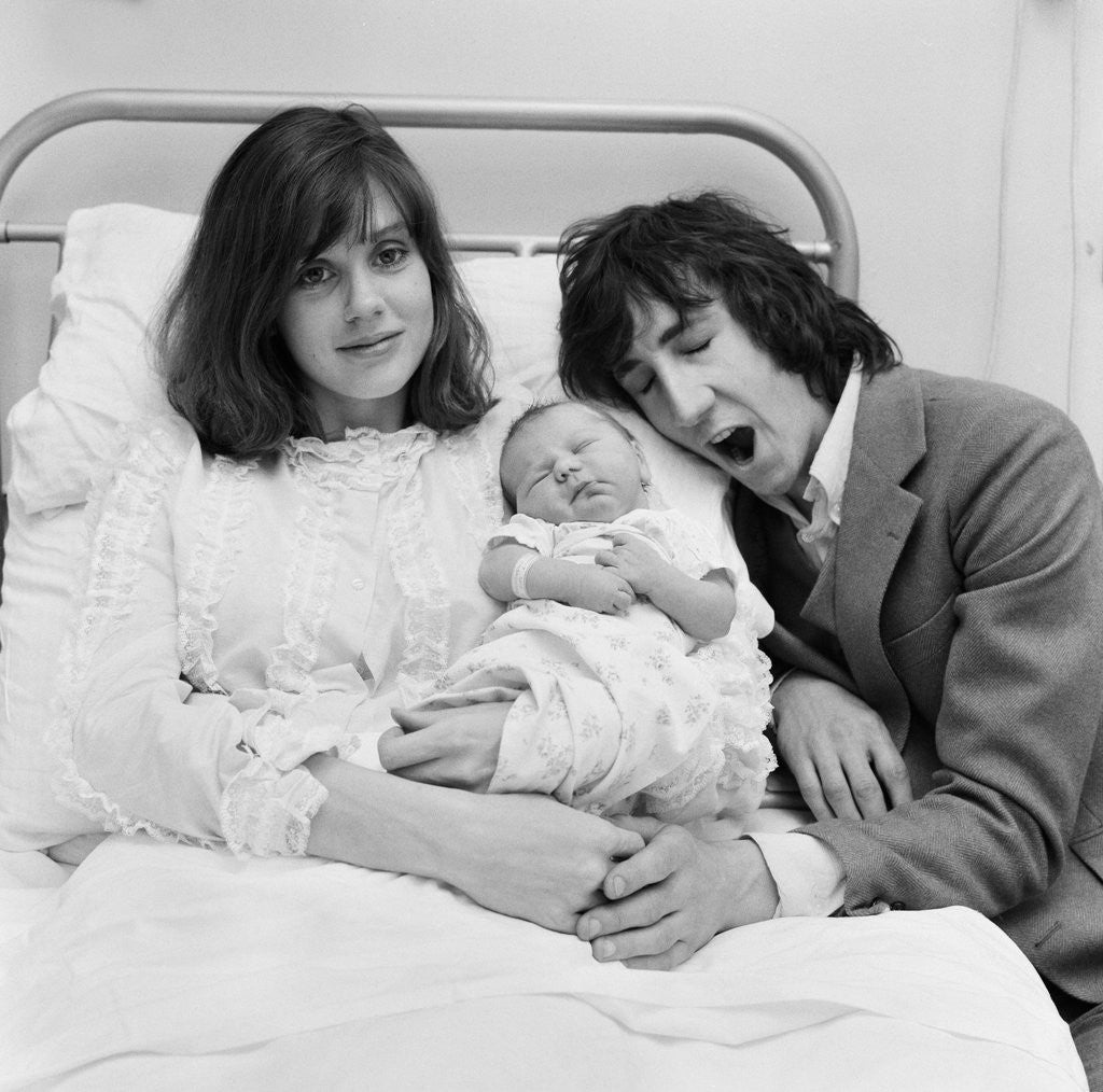 Pete Townshend of British rock group The Who with his wife Karen and their new born baby daughter at Queen Charlotte's hospital, London. 30th March 1969.