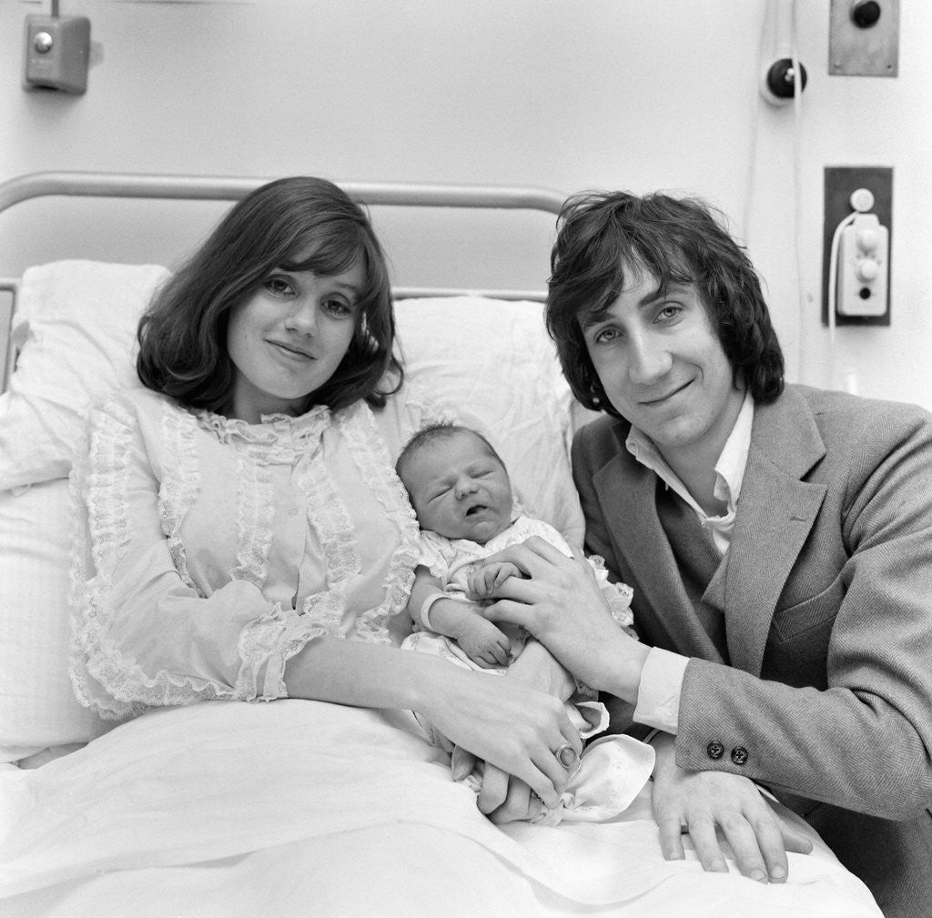 Pete Townshend of British rock group The Who with his wife Karen and their new born baby daughter at Queen Charlotte's hospital, London. 30th March 1969.