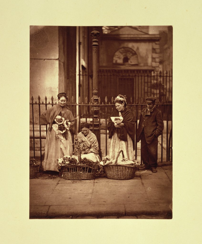 Covent Garden Flower Women, from Victorian London Street Life, by John Thomson (1837-1921). Sepia photography. London, England, 1876-77.