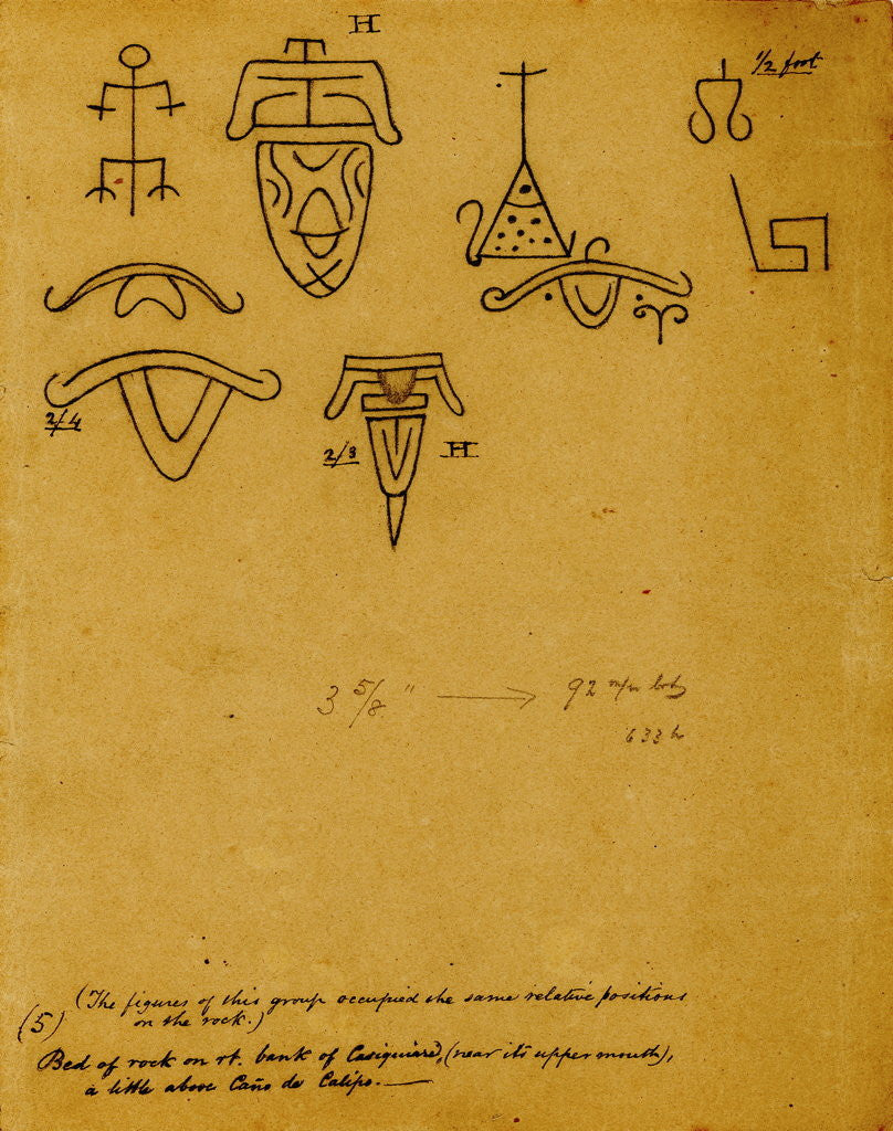Figures of picture-writing or pictograms found carved into rock on the right bank of the River Casiquiari, a little above Caño de Calipo.