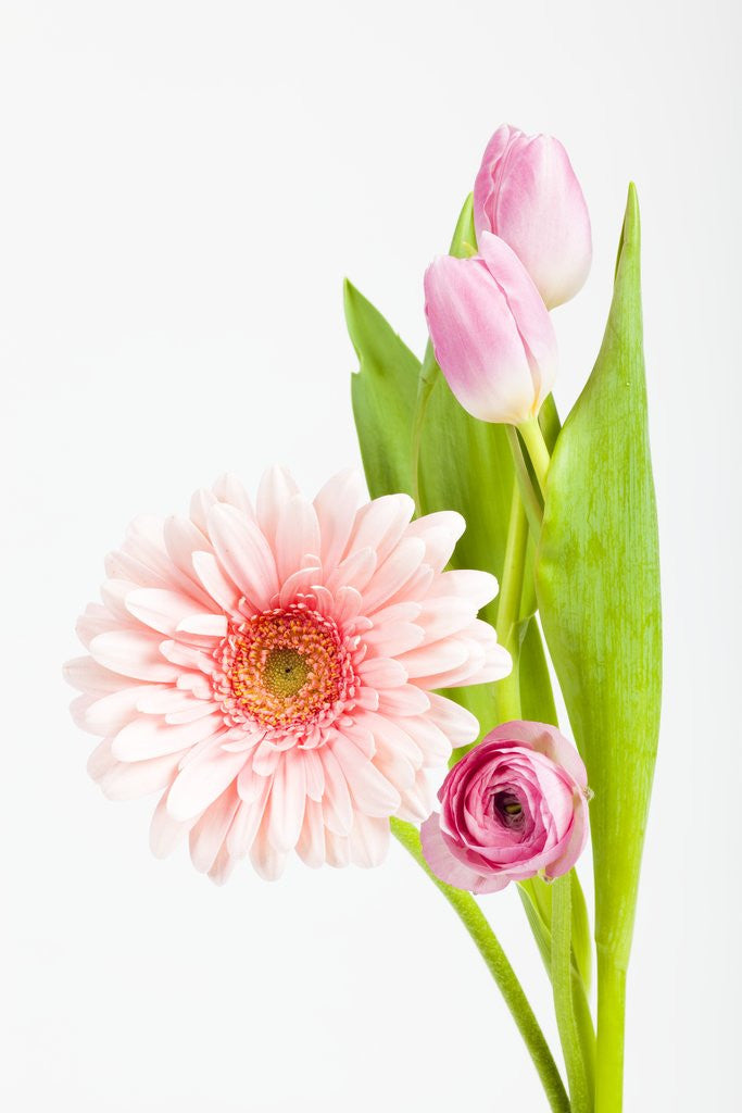 Product images of Pink Gerbera daisy, tulip and ranunculus