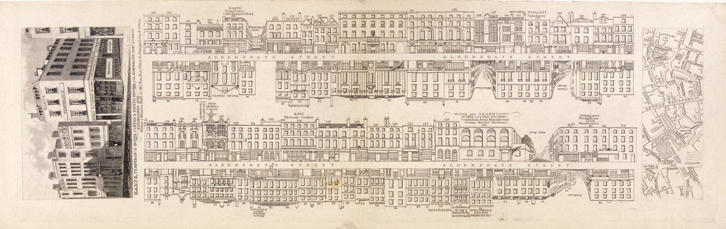 Plan of Aldersgate Street, London, c1839. With elevation of shops, houses and a Welsh chapel. It also incorporates view of Harts Temperence Hotel and a small plan of the surrounding area.