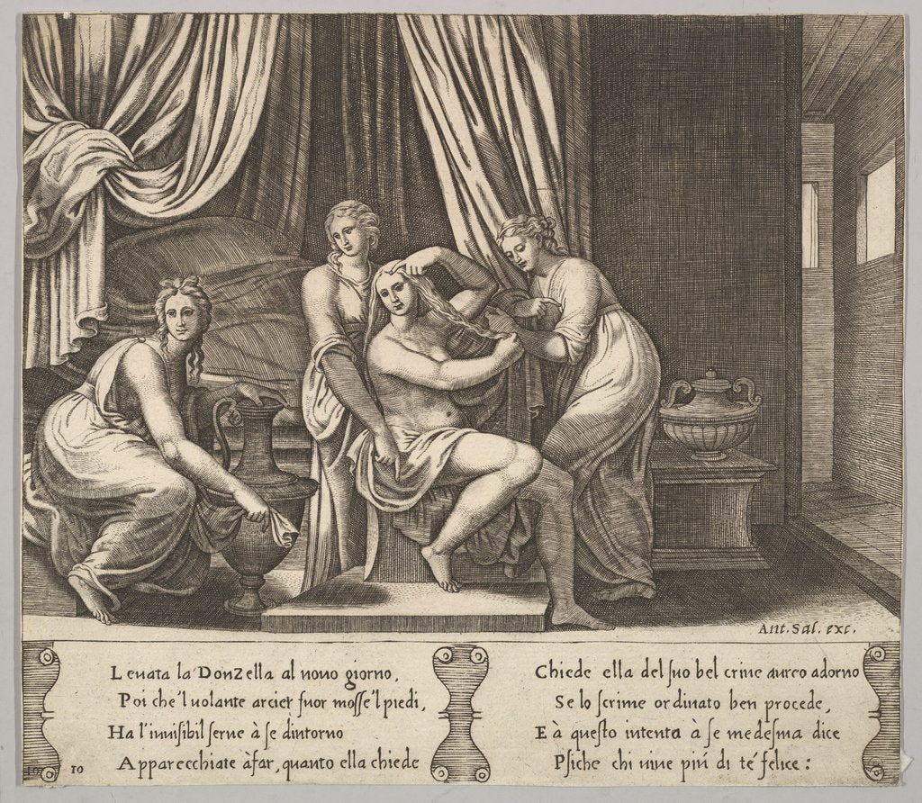 Plate 10: nymphs assisting Psyche to dress her hair, from 'The Fable of Psyche', 1530-60.
