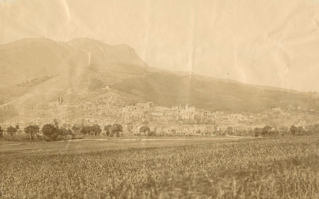 Landscape showing the town of Polla, Italy, between fields and mountains. Inscribed in pencil verso 'Polla 6'. Not numbered. The town is described in Mallet's 1862 Report, vol.1 pp.291-321. Collected by Robert Mallet.