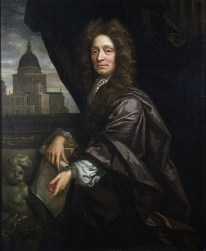 This lively portrait shows Wren at three-quarter length, wigged, and dressed in a white shirt and lace cravat over which is a loose brown robe. He holds a partly rolled sheet of paper in his right hand and points with his left. A marble statue of a child, or putto, with acanthus leaves is by the paper. Behind, revealed by a curtain, is St. Paul's Cathedral, London. Christopher Wren was elected a Fellow of the Royal Society in 1660, he served as its President from 1680 to 1682. Wren was a founder of the Society.