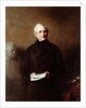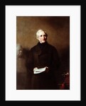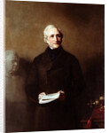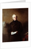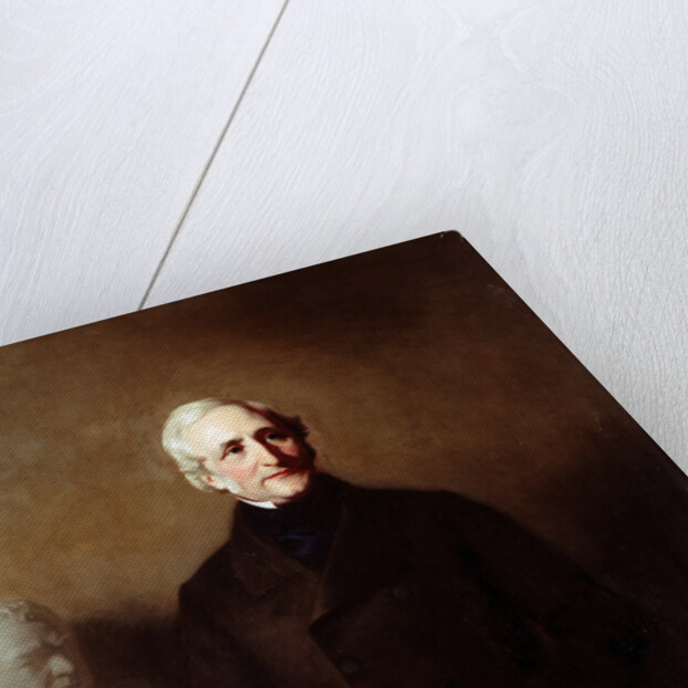 Half-length portrait of Edward Sabine looking to the viewer's right. Dressed in a dark single-breasted frock coat, black tie and high collared shirt. Sabine holds in both hands a paper document with a round brass tie, the paper headed: 'Terrestrial Magnetism 11'18'. Sabine is posed with regalia to signify his office as President of the Royal Society. To the left of the painting and slightly behind Sabine is the Society's sculpture bust of Sir Joseph Banks by Sir Francis Chantrey. To the right and in front of Sabine is the head of the Society's silver mace lying on its red velvet and tasselled cushion. Sabine was elected a Fellow of the Royal Society in 1818, he served as its President from 1861-1871.