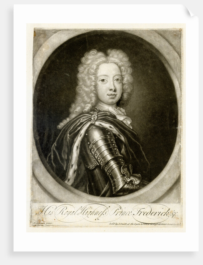 Oval half length portrait of Prince Frederick dressed in armour with an ermine trimmed robe held in place by a jewelled clasp at the shoulder and wearing a shoulder length wig. Inscribed: 'His Royal Highness Prince Frederick, &c. Fountain pinx. Sold by I: Smith at the Lyon & Crown in Russell Street Covent Garden'. In pencil lower left 'Elected 1728' Frederick, Prince of Wales, was elected a Fellow of the Royal Society in 1728.