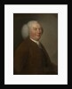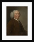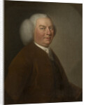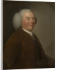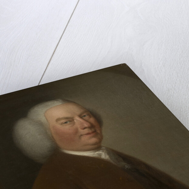 Head and shoulders portrait of a man dressed in a brown coat with waistcoat and a white cravat. His body is angled to the right as viewed, the face in half-profile. The sitter wears a grey bob wig and appears to be a man of the professions [possibly a physician?].