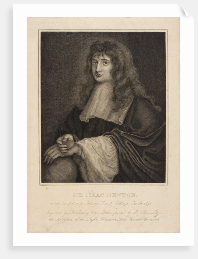 Half-length portrait of a young man with long hair, wearing an academic gown, his hands resting on a globe. Inscribed below: 'SIR ISAAC NEWTON, when Bachelor of Arts in Trinity College, Cambridge. Engraved by Bt. Reading from a Head painted by Sir Peter Lely in the possession of the Right Honorable Lord Viscount Cremorne'. Isaac Newton was elected a Fellow of the Royal Society in 1672, he served as its President from 1703 to 1727.