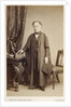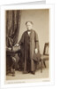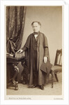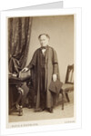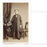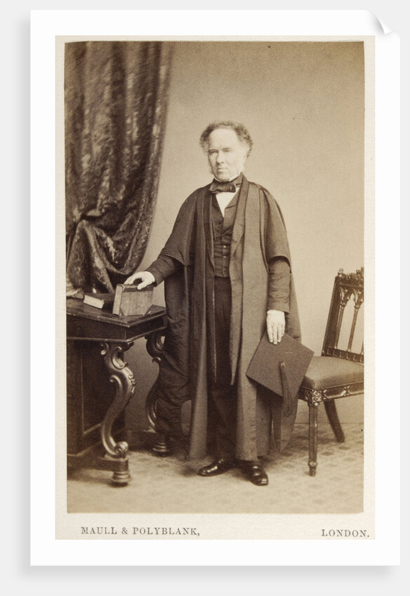 Full length studio portrait of the Reverend James Challis standing in academic robes, his right hand on the spine of a book which rests upon a table. Behind is a curtain or drape with a chair to the right of picture. Printed below the image: 'MAULL & POLYBLANK, LONDON. The reverse has various inscriptions. Printed: 'MAULL & POLYBLANK, Photographers, 55 GRACECHURCH STREET, and 187a, PICCADILLY LONDON.' James Challis was elected a Fellow of the Royal Society in 1848.