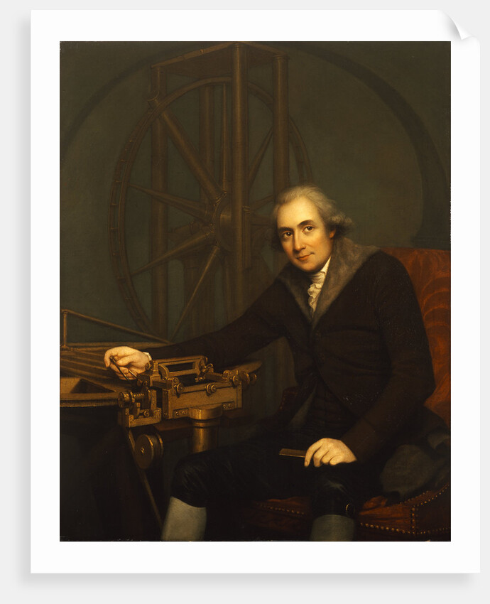 Three quarter length portrait of Jesse Ramsden, seated in a red upholstered chair. Ramsden wears a black jacket trimmed with grey fur at the collar over a white shirt and black knee-breeches, the tops of his grey stockings just visible. Ramsden holds callipers in his right hand and a metal straight-edge or ruler in his left. Behind there is an astronomical circle (telescope mounted on an azimuth circle); before the sitter is a dividing engine to Ramsden's design. [Discussed in Jesse Ramsden (1735-1800) London's leading scientific instrument maker, Anita McConnell (Aldershot, Ashgate, 2007), pp.39-51]. Jesse Ramsden was elected a Fellow of the Royal Society in 1786.
