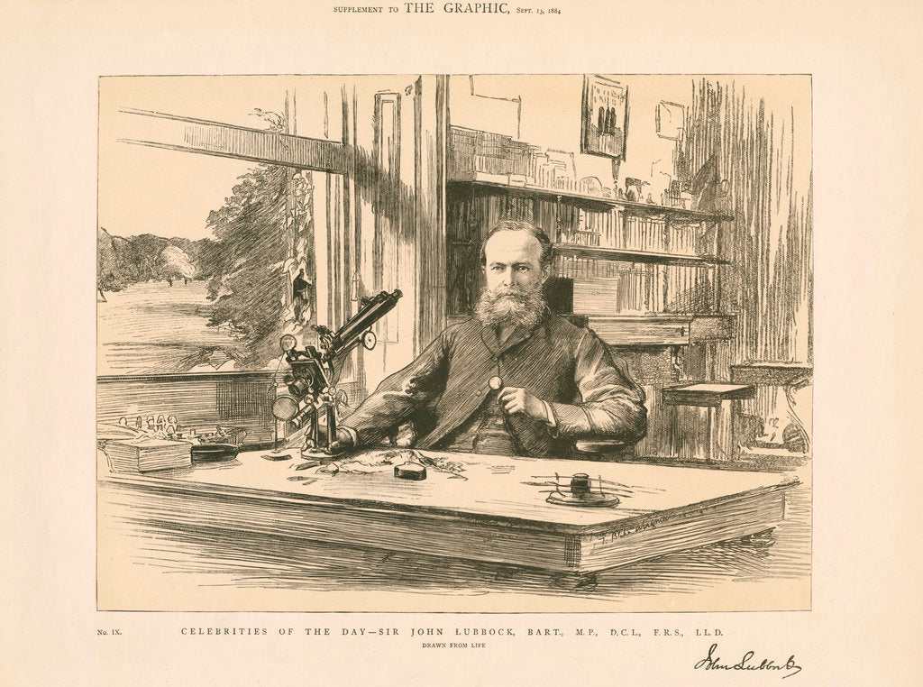 Half-length portrait of Sir John Lubbock, seated at his desk by a study window at High Elms in Kent. Lubbock holds the base of a compound microscope in his right hand and has a single lens magnifying glass in his left hand. There are specimens and an inkwell on the table. A bookcase appears behind him and Lubbock's wooded estate is visible through the window. Inscribed above: 'SUPPLEMENT TO THE GRAPHIC , Sept. 13 1884.' Continued below: 'No. IX. CELEBRITIES OF THE DAY ûSIR JOHN LUBBOCK, BART., M.P., D.C.L., F.R.S., LL.D. DRAWN FROM LIFE'. With a facsimile signature lower right. Lubbock was elected a Fellow of the Royal Society in 1858.