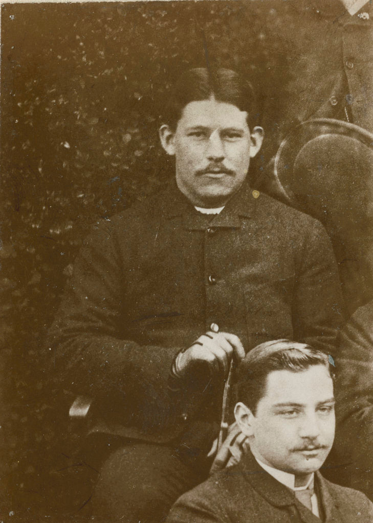 Half-length seated portrait of Richard Threlfall, facing, wearing gloves and holding a cane: with (below) head and shoulders of John George Adami, looking to the viewer's right. Extracted from a picture of a larger group. Inscribed and signed by Charles Scott Sherrington verso, in pencil,: 'Threlfall & Adami as undergraduates given me by Alexander Scott C.S.Sherrington.' Inscribed in ink on mount: 'Richard Threlfall & J.G.Adami at Cambridge. Taken by Dr Alexander Scott & by him given to me.' Richard Threlfall attended Gonville and Caius College, University of Cambridge, graduating in 1884.J.G.Adami attended Christ's College, Cambridge from 1880. Collected, with other ephemera, by Sir Charles Scott Sherrington FRS (1857-1952) and incorporated, with other tracts in Sherrington's volume Items touching the Royal Society.