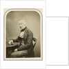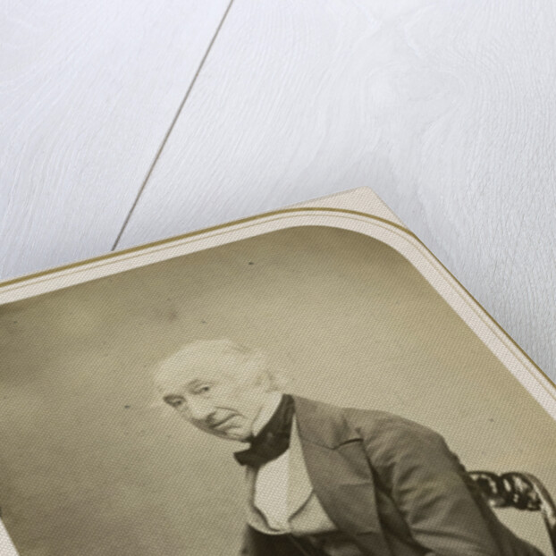Three quarter length studio portrait of W J Hooker seated on a chair with a fleur-de-lys pattern, facing a small table upon which he holds a book. A pair of spectacles hang from a chain at waist level. Arched gold surround, inscribed below in gold: 'Photographed by MAULL & POLYBLANK, 55, Gracechurch Street and 187A Piccadilly, London.' Signed below in ink 'Wm. Jackson Hooker'. Inscribed verso in pencil: 'Sir Wm. Hooker F.R.S. &c, &c, &c, Celebrated Botanist, Author &c Kew'. William Jackson Hooker was elected a Fellow of the Royal Society in 1812.