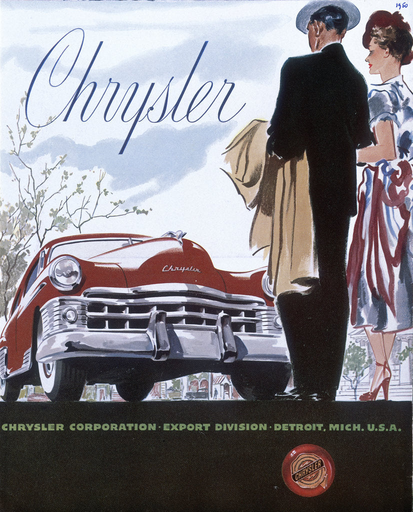Poster advertising a Chrysler, 1950. A smartly dressed couple stand and look at their new Chrysler car.