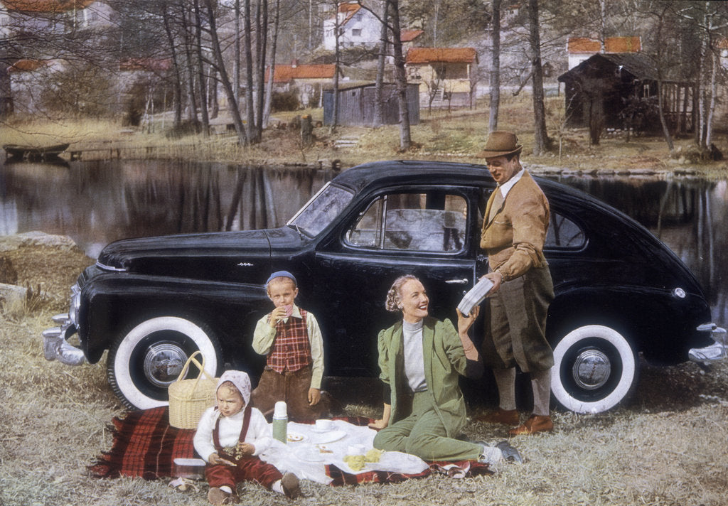 Poster advertising a Volvo 444, 1953. A family picnicing in front of their car by the side of a lake.