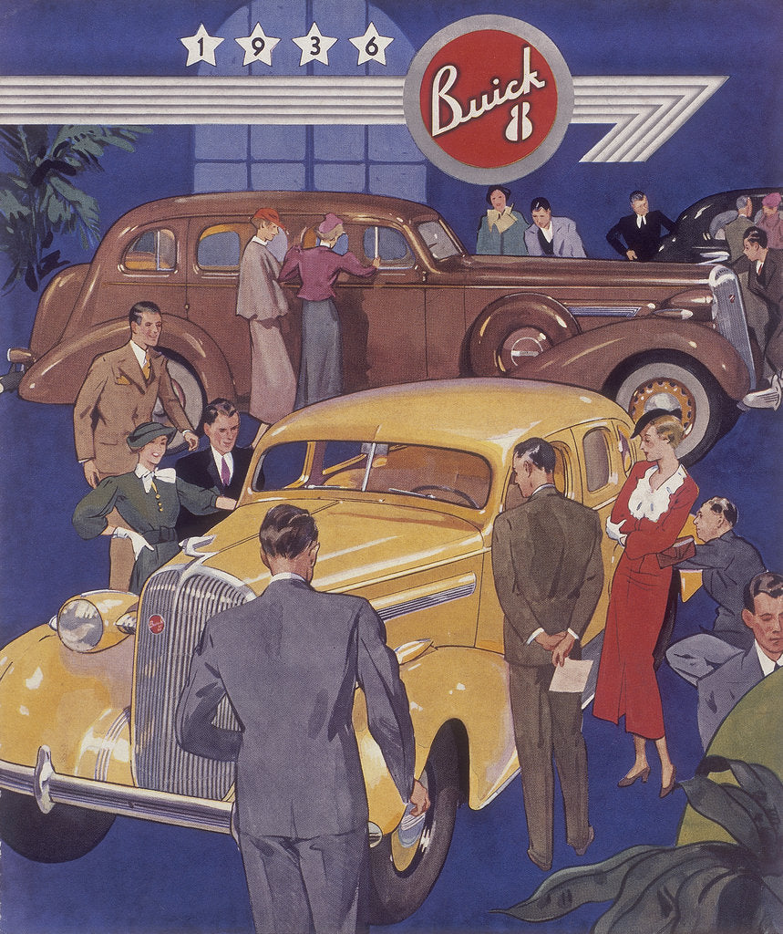 Poster advertising Buick cars, from a catalogue, 1936. People at a motor show or car showroom admiring the Buick 8.