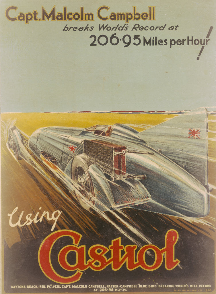 Poster advertising Castrol, featuring Bluebird, 1928. Bluebird speeding across Daytona Beach, Florida, setting the world land speed record at 206.95mph.