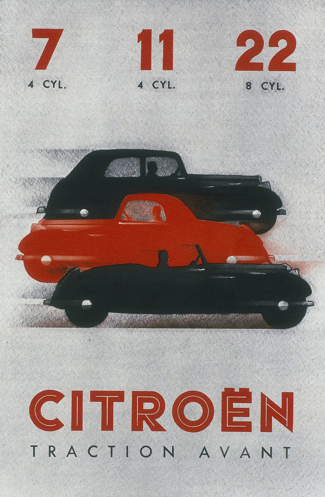 Poster advertising Citroën cars, from the Traction Avant catalogue, 1934. The 7, 11 and 22 models are advertised, including 4- and 8-cylinder versions. Traction Avant, front-wheel drive, was a revolutionary innovation of Citroën introduced in 1934 and provided improved roadholding and comfort.