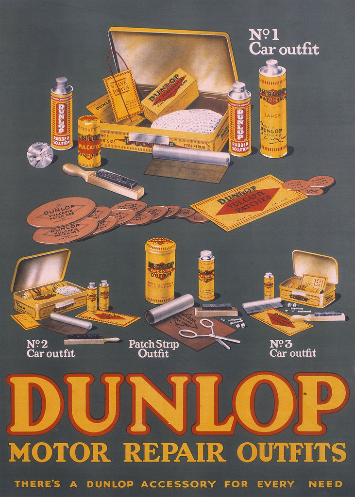 Poster advertising Dunlop products. Various car kits including brushes, patch kits, and valve parts.