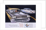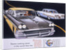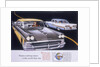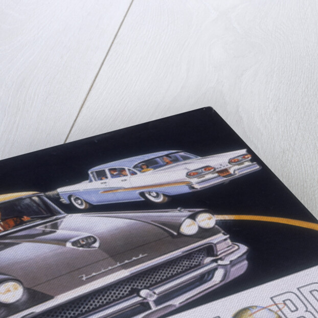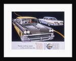 Poster advertising the Ford Fairlane car, 1958. Two Ford Fairlanes pass each other on a stylised road.