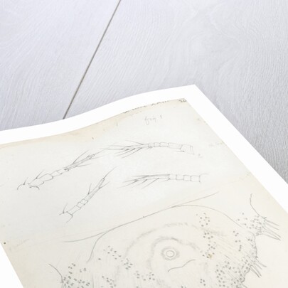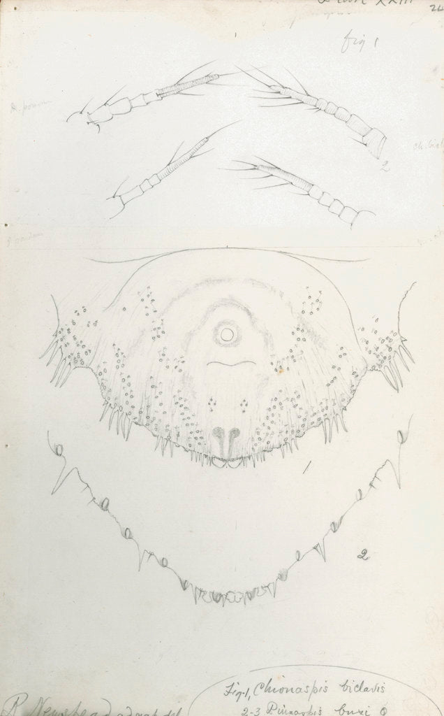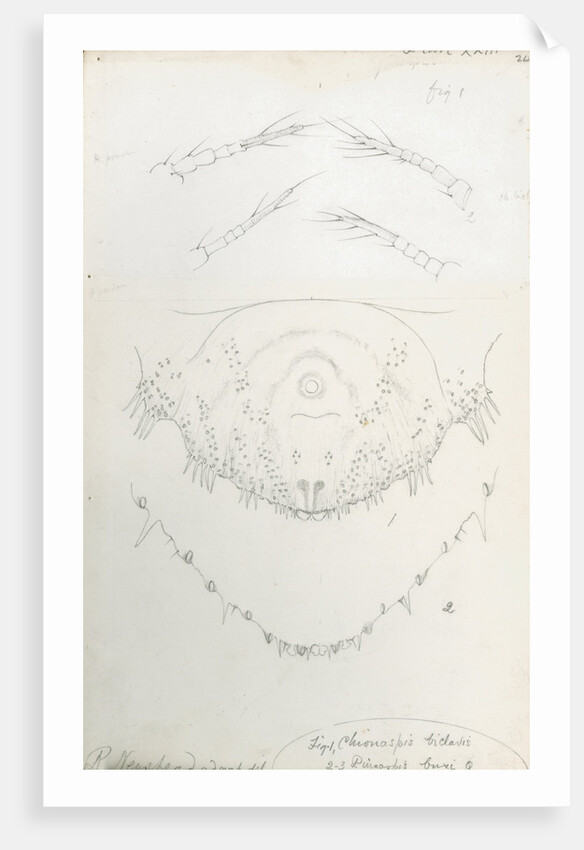 Plate 23, 'Monograph of the Coccidae of the British Isles', by Robert Newstead (Ray Society, 1900-1902). Margins of pygidium of two varieties of scale insects. Figure 1 Chionaspis biclavis. Figures 2-3 Pinnaspis buxi. At x250 and x600 magnifications. Signed 'R.Newstead ad nat del.' cropped. Figure 3 was originally pasted over an alternative figure 1 and has subsequently become detached and loose in the volume. The facing page is an approved [in pencil] proof version of captions, 'Explanation of Plate XXIII'.